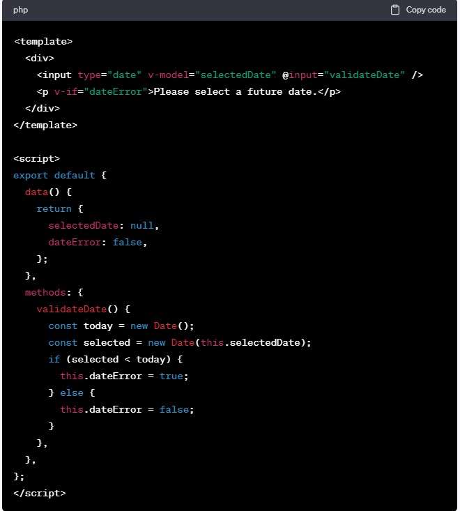 Finally, we use a v-if directive to conditionally render an error message if dateError is true.